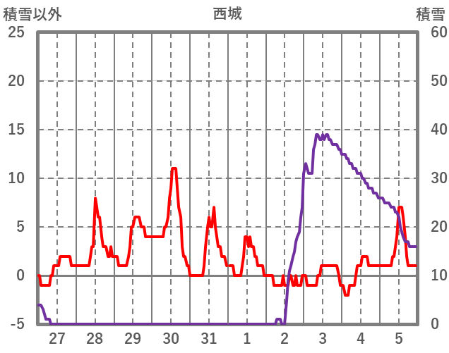 | 日 | 時 | 気温 | 降水 | 風向/風速 | 日照 | 積雪 | 降雪 |