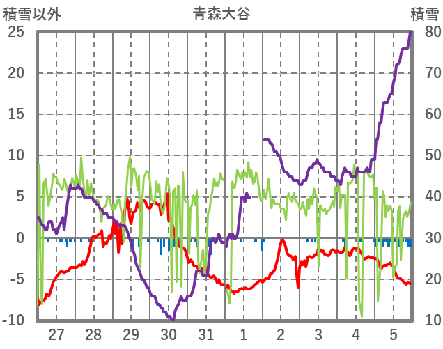 | 日 | 時 | 気温 | 降水 | 風向/風速 | 日照 | 積雪 | 降雪 |