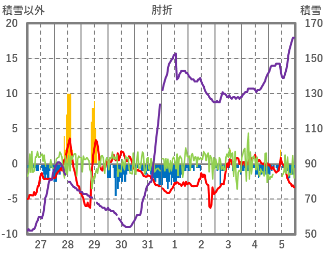 | 日 | 時 | 気温 | 降水 | 風向/風速 | 日照 | 積雪 | 降雪 |