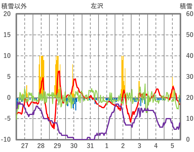 | 日 | 時 | 気温 | 降水 | 風向/風速 | 日照 | 積雪 | 降雪 |
