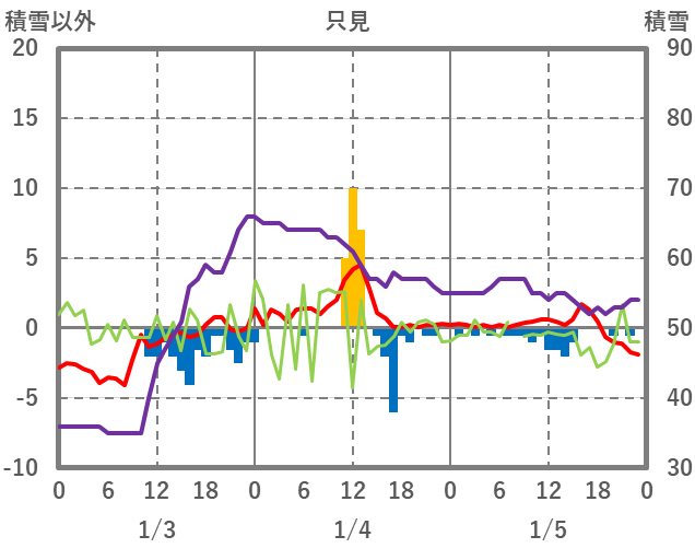 | 日 | 時 | 気温 | 降水 | 風向/風速 | 日照 | 積雪 | 降雪 |