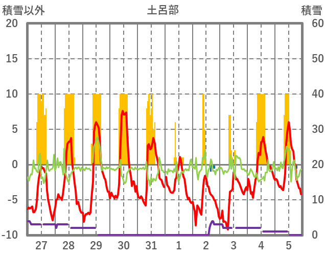 | 日 | 時 | 気温 | 降水 | 風向/風速 | 日照 | 積雪 | 降雪 |