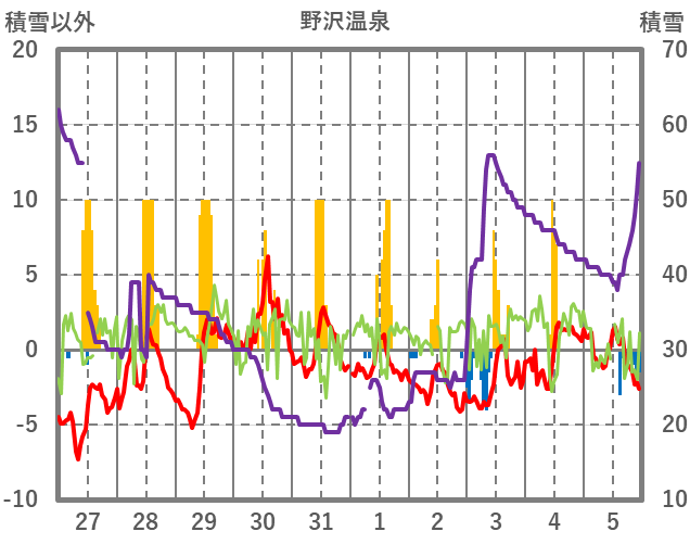 | 日 | 時 | 気温 | 降水 | 風向/風速 | 日照 | 積雪 | 降雪 |