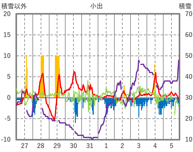 | 日 | 時 | 気温 | 降水 | 風向/風速 | 日照 | 積雪 | 降雪 |