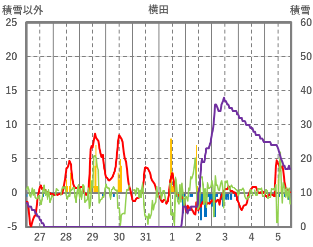 | 日 | 時 | 気温 | 降水 | 風向/風速 | 日照 | 積雪 | 降雪 |