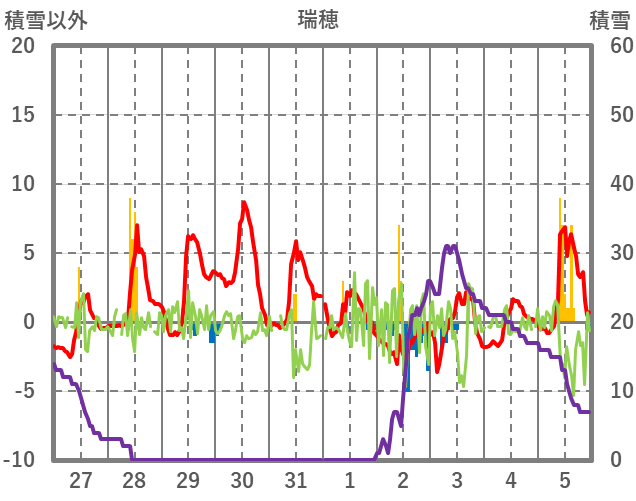 | 日 | 時 | 気温 | 降水 | 風向/風速 | 日照 | 積雪 | 降雪 |