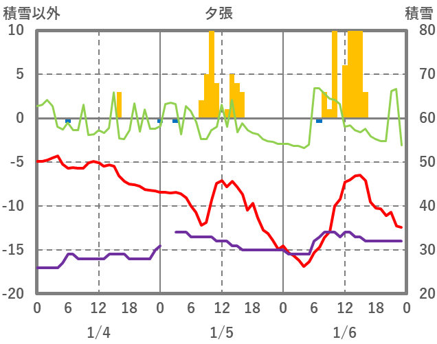 | 日 | 時 | 気温 | 降水 | 風向/風速 | 日照 | 積雪 | 降雪 |