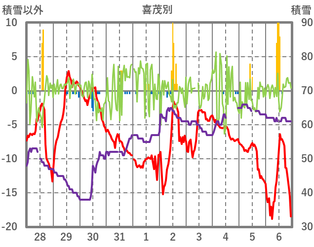| 日 | 時 | 気温 | 降水 | 風向/風速 | 日照 | 積雪 | 降雪 |
