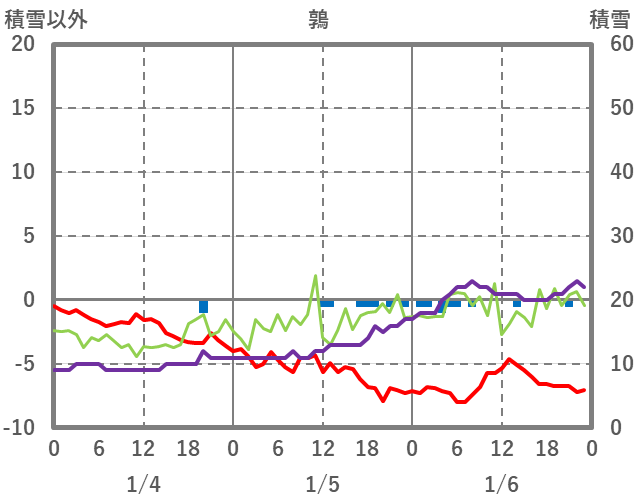 | 日 | 時 | 気温 | 降水 | 風向/風速 | 日照 | 積雪 | 降雪 |