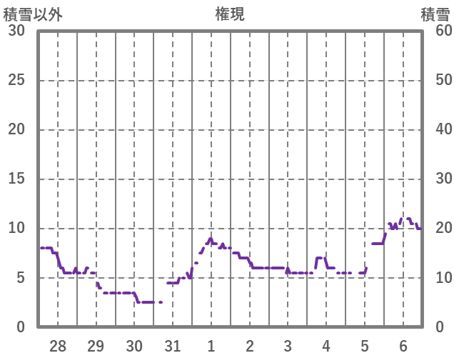 | 日 | 時 | 気温 | 降水 | 風向/風速 | 日照 | 積雪 | 降雪 |
