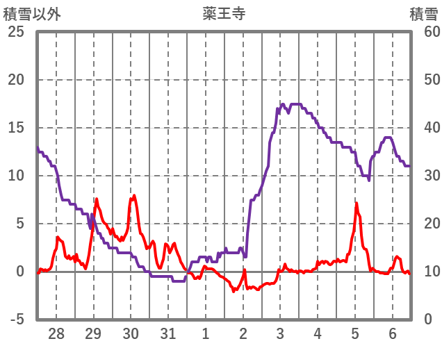 | 日 | 時 | 気温 | 降水 | 風向/風速 | 日照 | 積雪 | 降雪 |