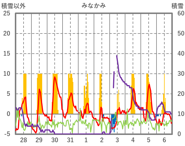 | 日 | 時 | 気温 | 降水 | 風向/風速 | 日照 | 積雪 | 降雪 |