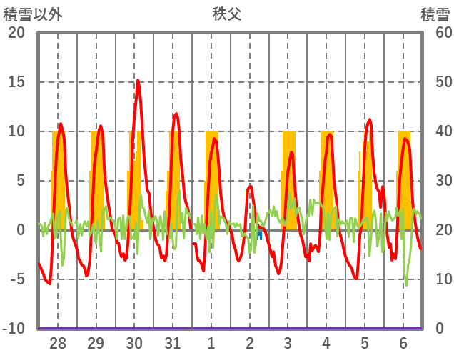 | 日 | 時 | 気温 | 降水 | 風向/風速 | 日照 | 積雪 | 降雪 |