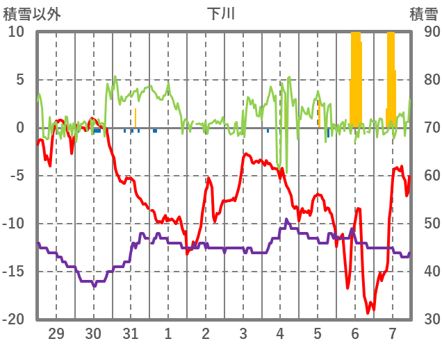 | 日 | 時 | 気温 | 降水 | 風向/風速 | 日照 | 積雪 | 降雪 |