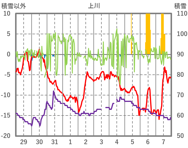| 日 | 時 | 気温 | 降水 | 風向/風速 | 日照 | 積雪 | 降雪 |