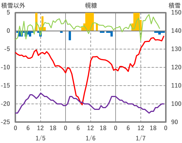 | 日 | 時 | 気温 | 降水 | 風向/風速 | 日照 | 積雪 | 降雪 |