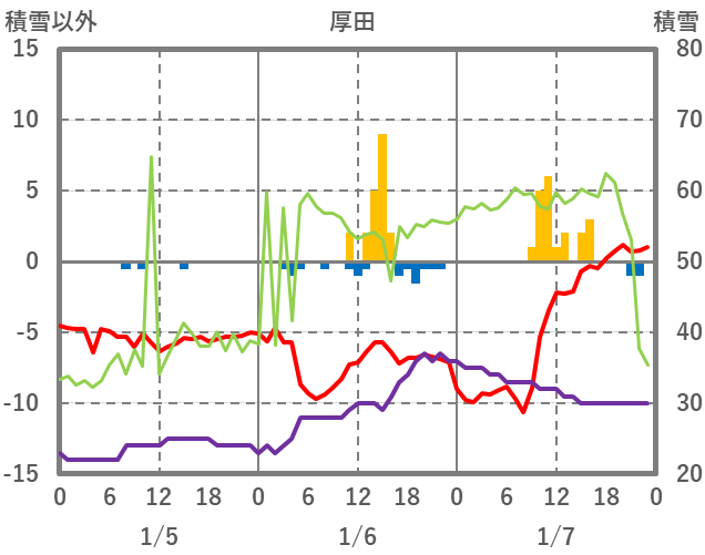| 日 | 時 | 気温 | 降水 | 風向/風速 | 日照 | 積雪 | 降雪 |