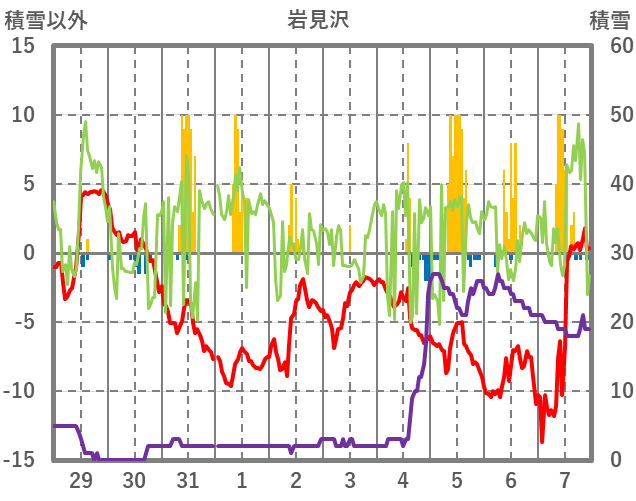 | 日 | 時 | 気温 | 降水 | 風向/風速 | 日照 | 積雪 | 降雪 |