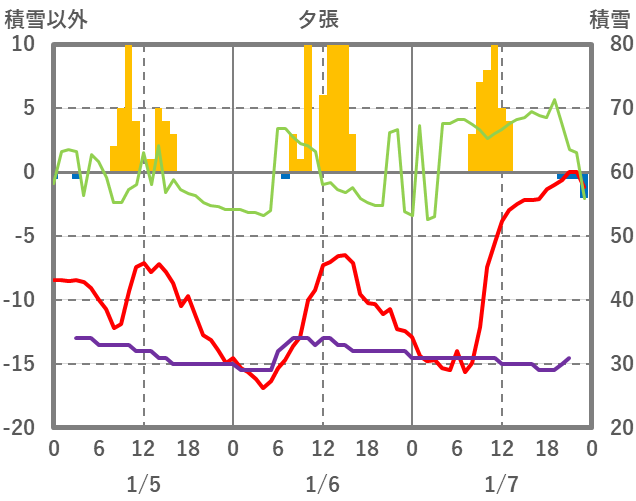 | 日 | 時 | 気温 | 降水 | 風向/風速 | 日照 | 積雪 | 降雪 |