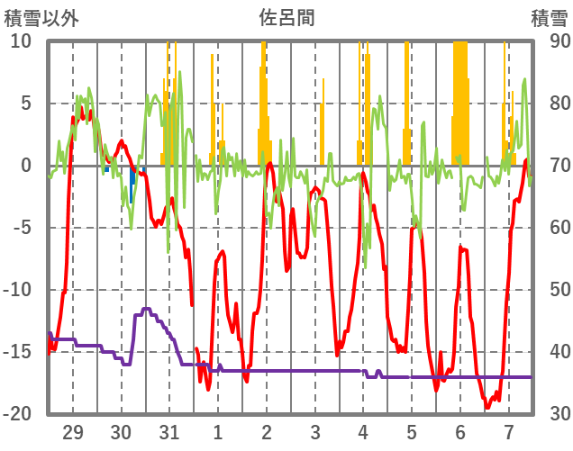 | 日 | 時 | 気温 | 降水 | 風向/風速 | 日照 | 積雪 | 降雪 |