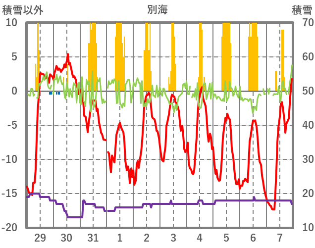 | 日 | 時 | 気温 | 降水 | 風向/風速 | 日照 | 積雪 | 降雪 |