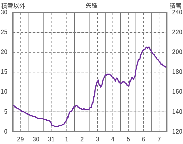 | 日 | 時 | 気温 | 降水 | 風向/風速 | 日照 | 積雪 | 降雪 |