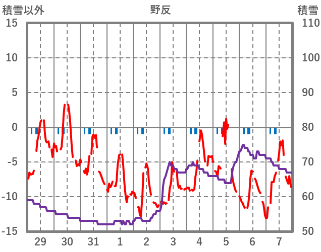 | 日 | 時 | 気温 | 降水 | 風向/風速 | 日照 | 積雪 | 降雪 |