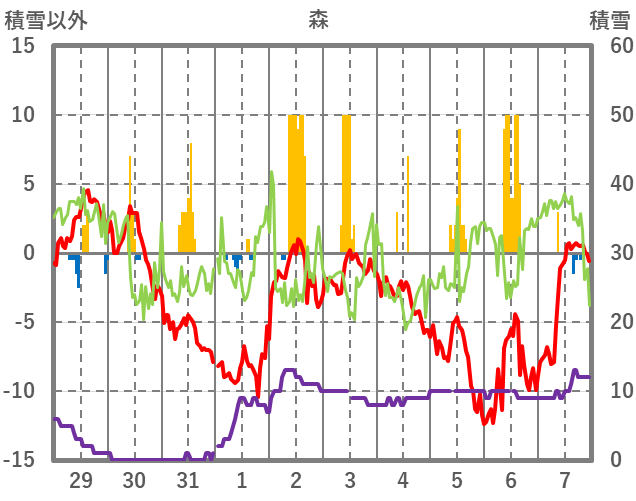 | 日 | 時 | 気温 | 降水 | 風向/風速 | 日照 | 積雪 | 降雪 |