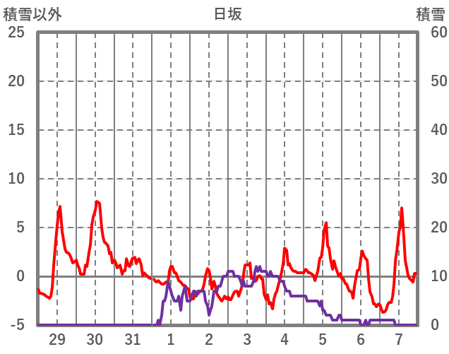 | 日 | 時 | 気温 | 降水 | 風向/風速 | 日照 | 積雪 | 降雪 |