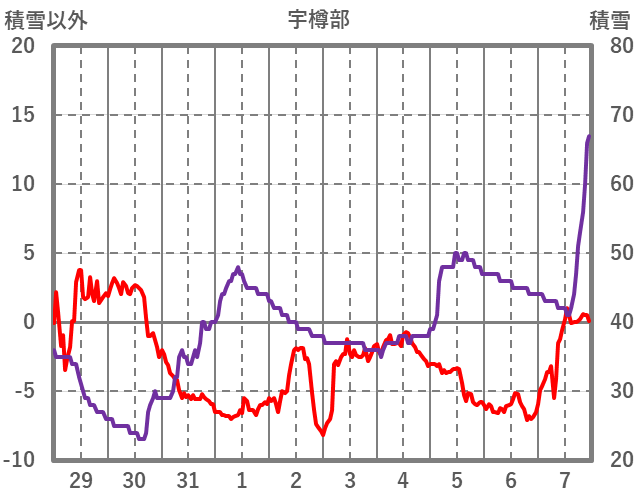 | 日 | 時 | 気温 | 降水 | 風向/風速 | 日照 | 積雪 | 降雪 |