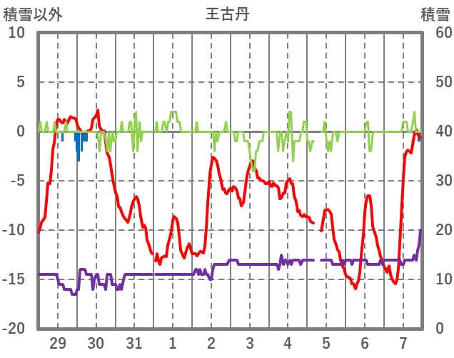 | 日 | 時 | 気温 | 降水 | 風向/風速 | 日照 | 積雪 | 降雪 |