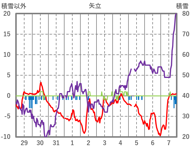 | 日 | 時 | 気温 | 降水 | 風向/風速 | 日照 | 積雪 | 降雪 |