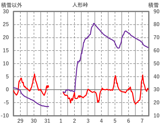 | 日 | 時 | 気温 | 降水 | 風向/風速 | 日照 | 積雪 | 降雪 |