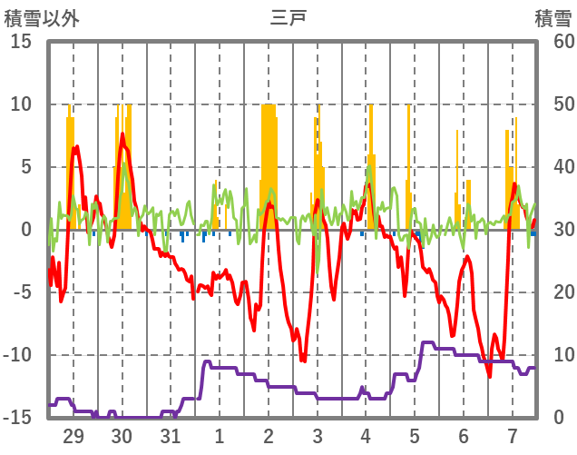 | 日 | 時 | 気温 | 降水 | 風向/風速 | 日照 | 積雪 | 降雪 |