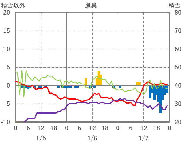 | 日 | 時 | 気温 | 降水 | 風向/風速 | 日照 | 積雪 | 降雪 |