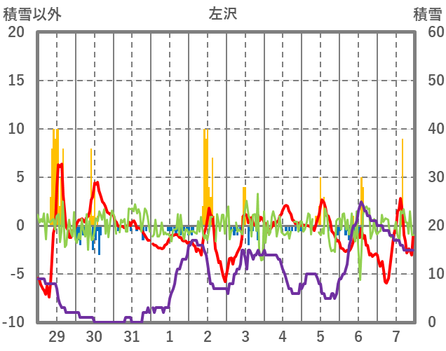 | 日 | 時 | 気温 | 降水 | 風向/風速 | 日照 | 積雪 | 降雪 |