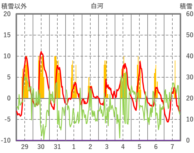 | 日 | 時 | 気温 | 降水 | 風向/風速 | 日照 | 積雪 | 降雪 |