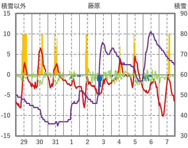 | 日 | 時 | 気温 | 降水 | 風向/風速 | 日照 | 積雪 | 降雪 |