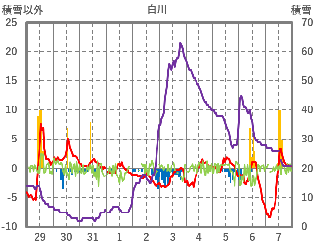 | 日 | 時 | 気温 | 降水 | 風向/風速 | 日照 | 積雪 | 降雪 |
