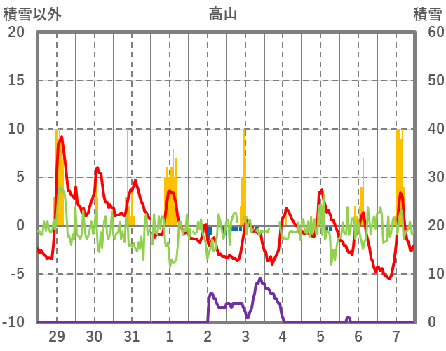 | 日 | 時 | 気温 | 降水 | 風向/風速 | 日照 | 積雪 | 降雪 |