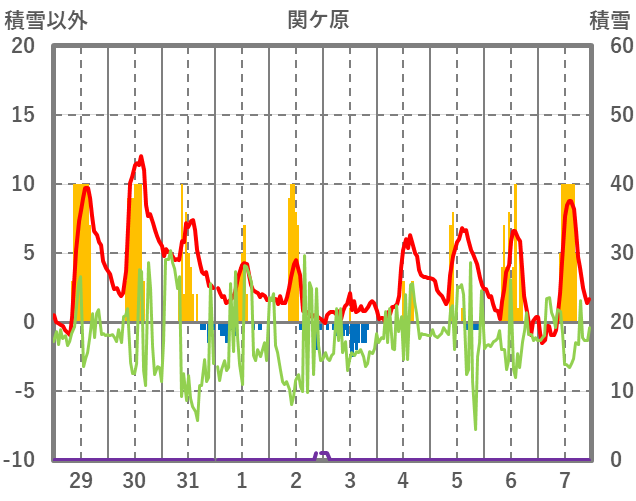 | 日 | 時 | 気温 | 降水 | 風向/風速 | 日照 | 積雪 | 降雪 |