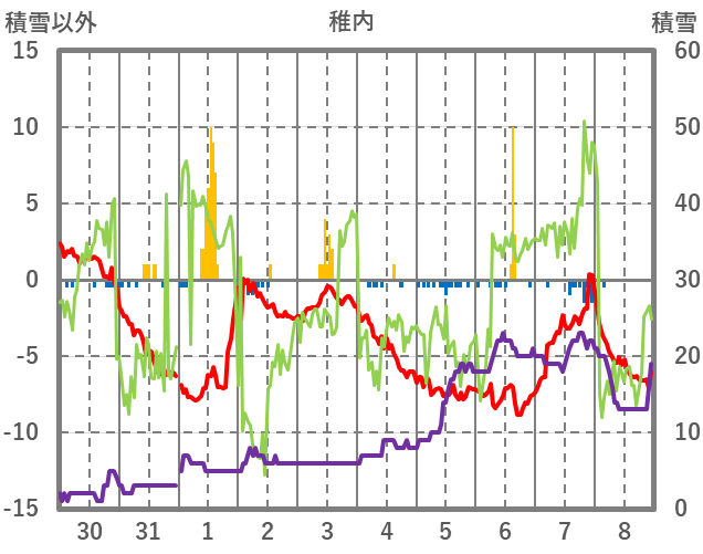 | 日 | 時 | 気温 | 降水 | 風向/風速 | 日照 | 積雪 | 降雪 |