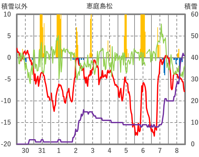 | 日 | 時 | 気温 | 降水 | 風向/風速 | 日照 | 積雪 | 降雪 |