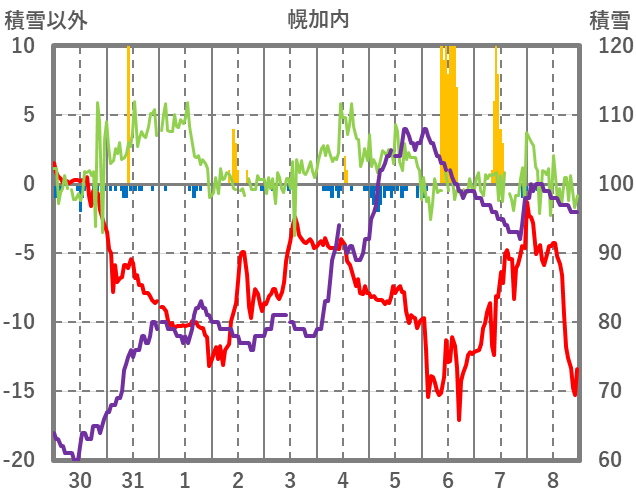 | 日 | 時 | 気温 | 降水 | 風向/風速 | 日照 | 積雪 | 降雪 |
