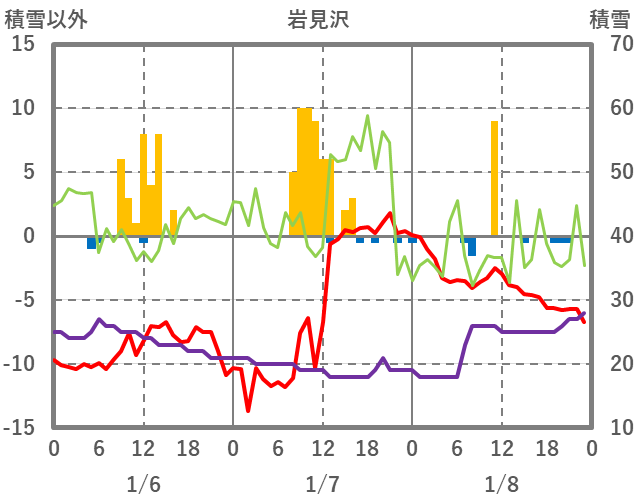 | 日 | 時 | 気温 | 降水 | 風向/風速 | 日照 | 積雪 | 降雪 |