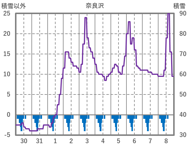 | 日 | 時 | 気温 | 降水 | 風向/風速 | 日照 | 積雪 | 降雪 |