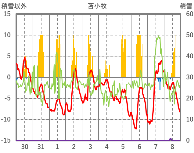 | 日 | 時 | 気温 | 降水 | 風向/風速 | 日照 | 積雪 | 降雪 |