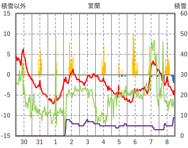 | 日 | 時 | 気温 | 降水 | 風向/風速 | 日照 | 積雪 | 降雪 |