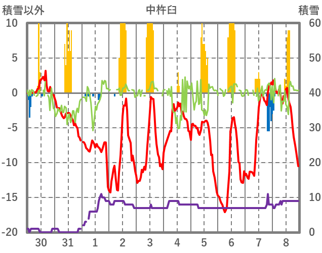 | 日 | 時 | 気温 | 降水 | 風向/風速 | 日照 | 積雪 | 降雪 |