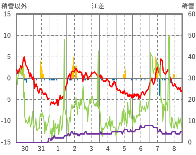 | 日 | 時 | 気温 | 降水 | 風向/風速 | 日照 | 積雪 | 降雪 |